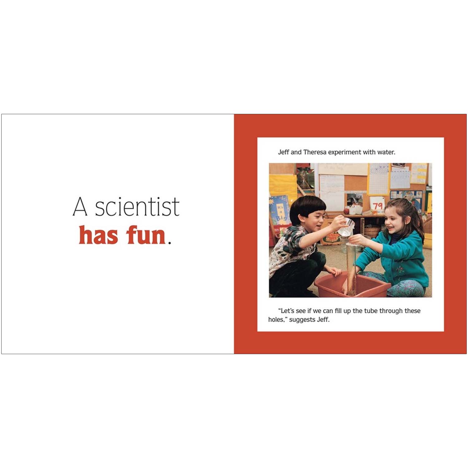 Simple text and full-color photographs depict children engaged in various activities that make up the scientific process: asking questions, noticing details, drawing what they see, taking notes, measuring, performing experiments, and more.
