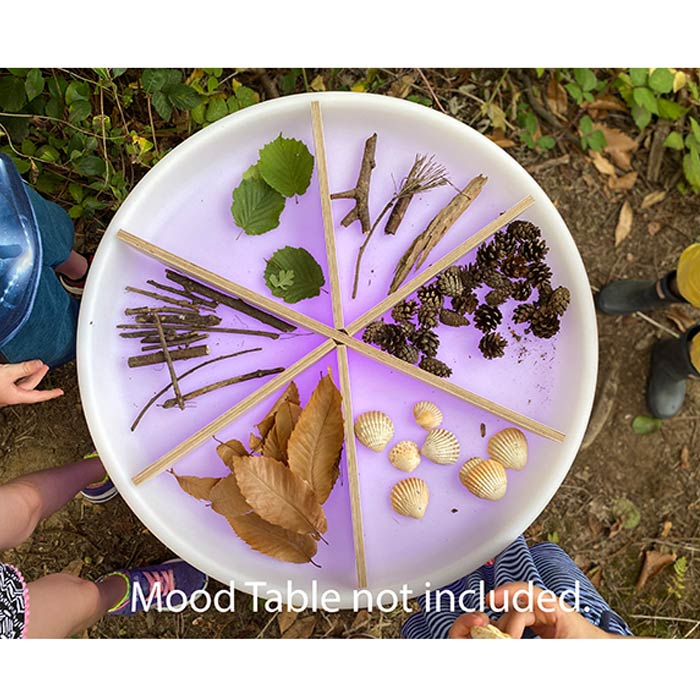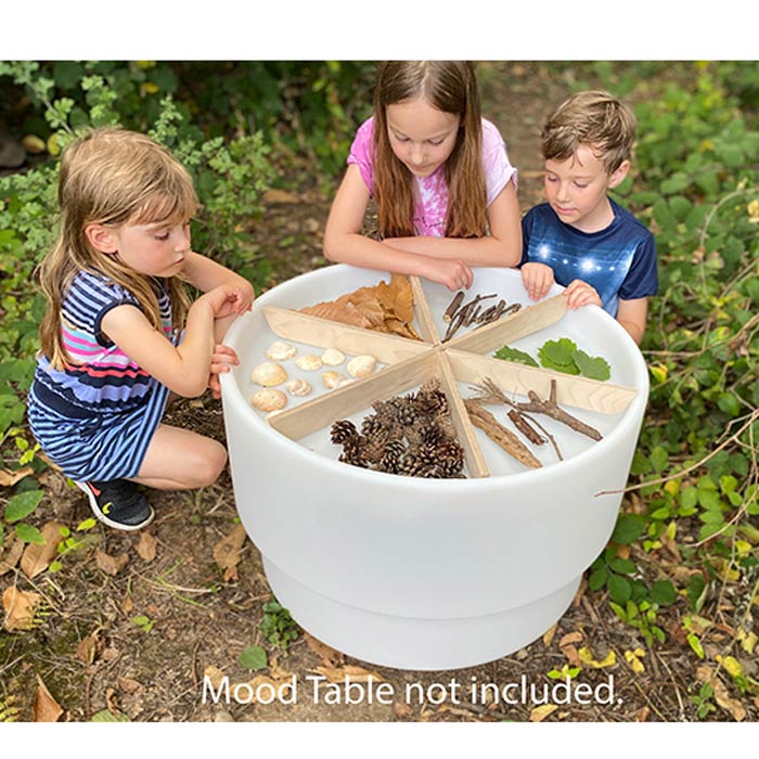 These dividers are ideal for both group and individual sensory and sorting activities. The wooden dividers are perfect for collecting sensory objects, loose parts, and natural materials, which can help prompt discussions about different characteristics. Use them inside the Sensory Mood Discovery Table or on a flat surface.