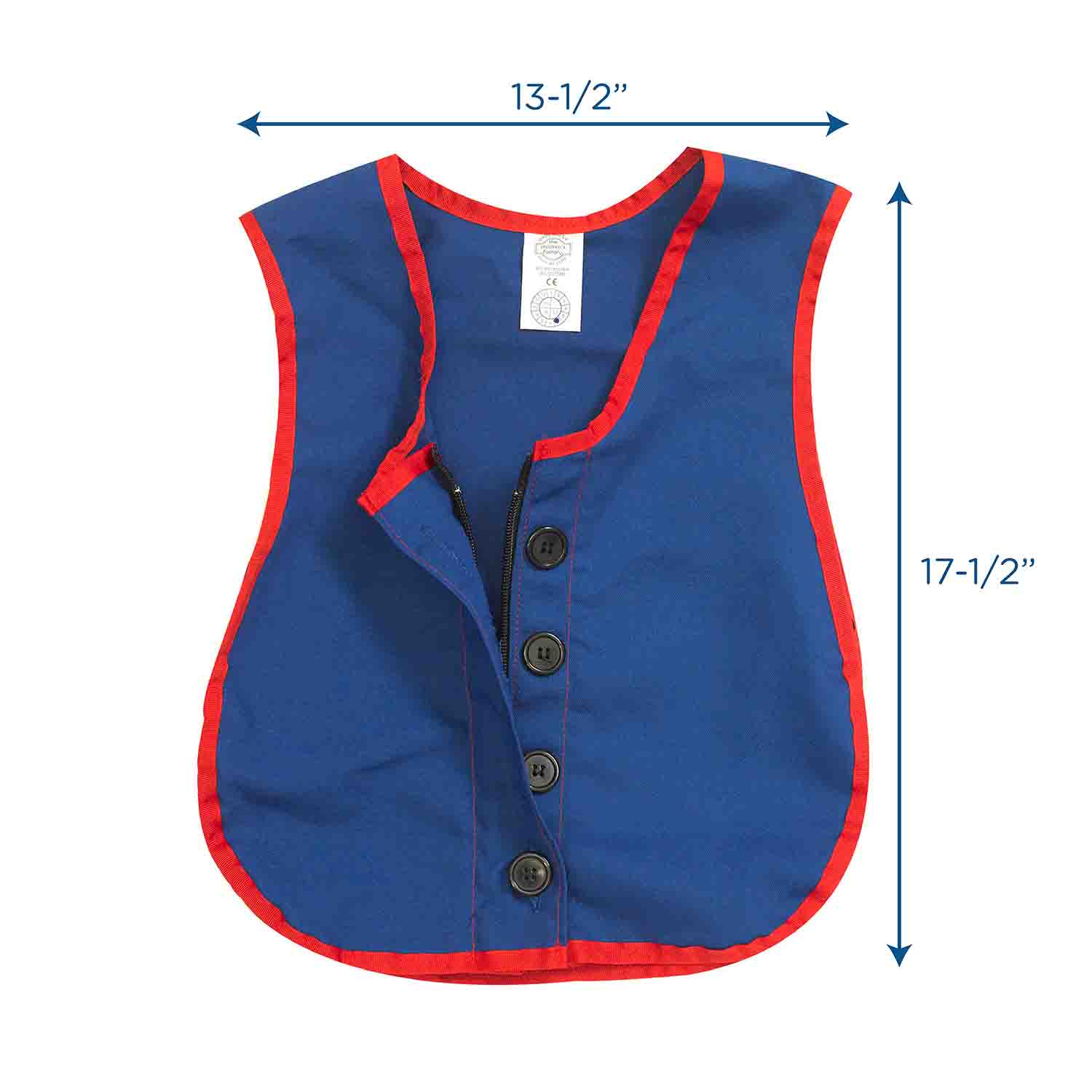 This dressing vest encourages beginners to practice dressing skills and develop finger dexterity! Heavy duty, cotton polyester blend vest has an elastic panel on each size, allowing one size to fit little ones.